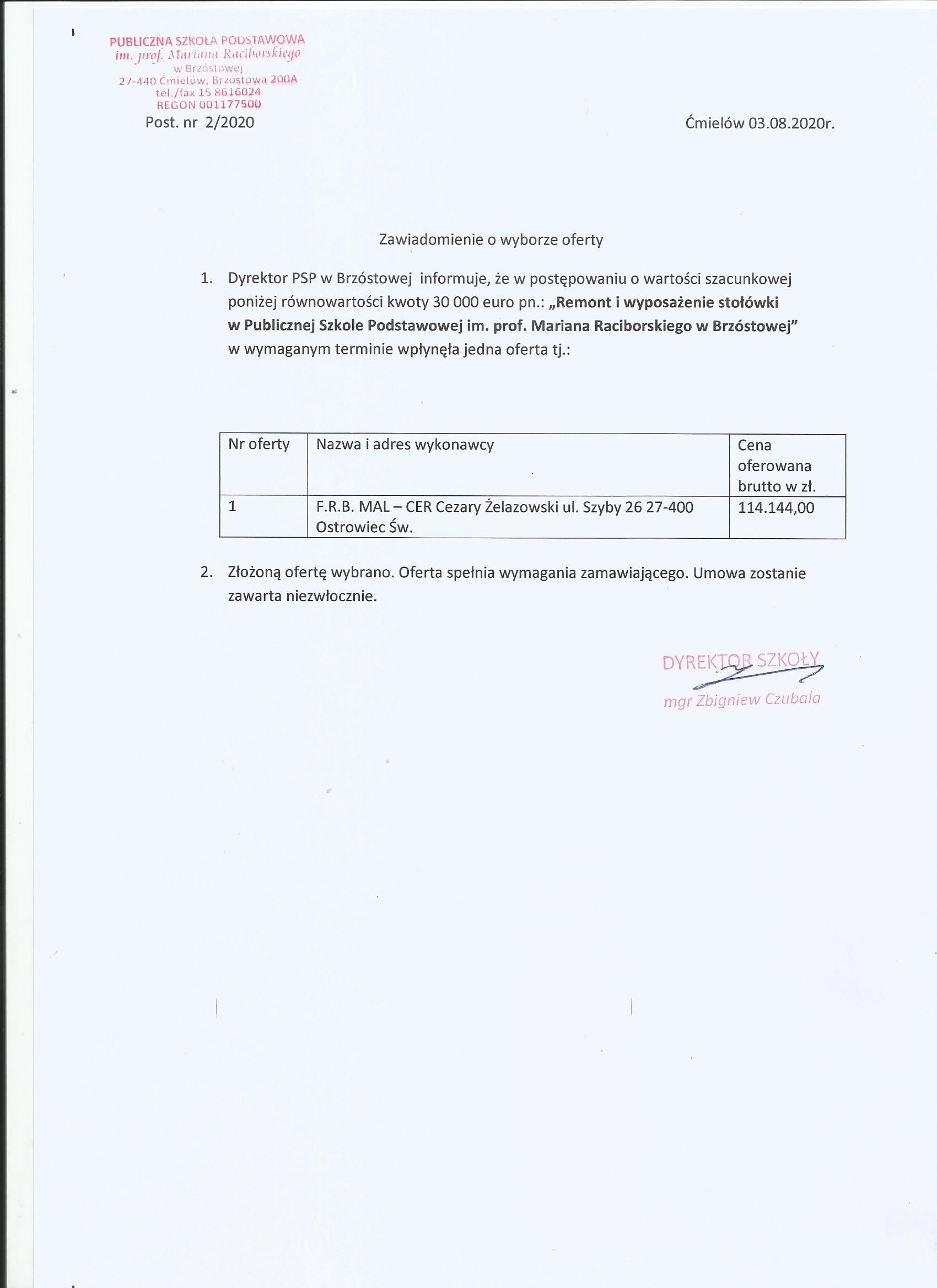 Zamawiający Nabywca: Gmina Ćmielów Płatnik: Publiczna Szkoła Podstawowa im. im. prof. Mariana Raciborskiego w Brzóstowej zaprasza do złożenia oferty cenowej w zamówieniu publicznym o wartości szacunkowej poniżej 30.000 euro na remont i wyposażenie stołówki w Publicznej Szkole Podstawowej im. prof. Mariana Raciborskiego w Brzóstowej w ramach modułu 3 wieloletniego rządowego programu „Posiłek w szkole i w domu” dotyczącego wspierania w latach 2019-2023 organów prowadzących publiczne szkoły podstawowe w zapewnieniu bezpiecznych warunków nauki, wychowania i opieki przez organizacje stołówek i miejsc spożywania posiłków.
